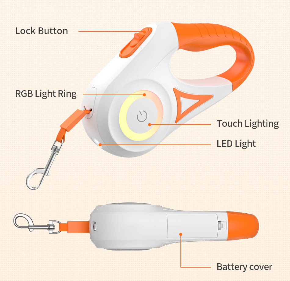- The Rojeco leash offers a two-sided RGB light ring, so you can walk your pet in unfavorable lighting conditions without worrying about safety. Up to 5 colors will be at your disposal.